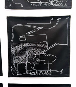 Sus composiciones remiten a lenguajes de representación propios de la cartografía digital y de las interfaces de geolocalización: trazados que nos recuerdan a mapas generados por herramientas digitales, referencias espaciales cercanas a coordenadas y una atención explícita al registro temporal, con indicaciones que sitúan el recorrido en fechas y momentos concretos del día. El resultado es una propuesta sobria y precisa, sostenida por la repetición, la observación y una temporalidad vivida.